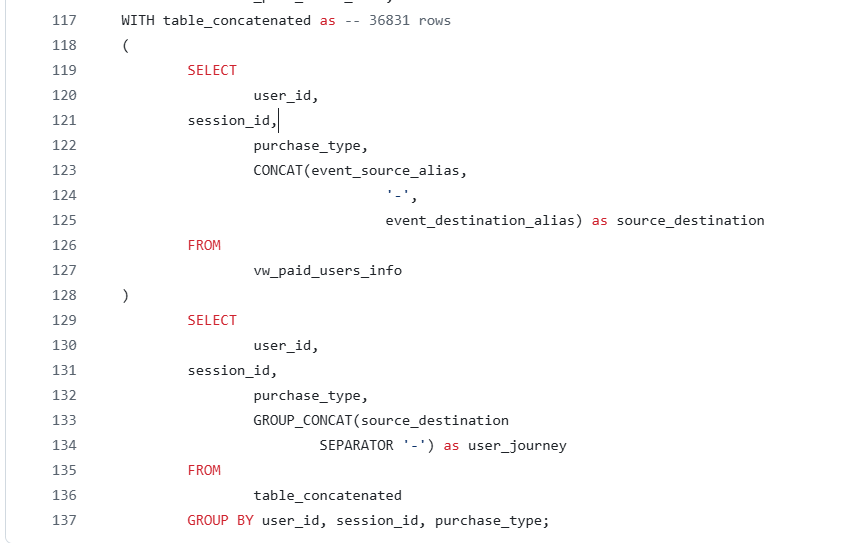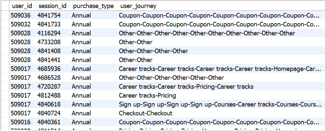 Using SQL, we focused on users who made their first paid purchase within the Q1 2023 timeframe. For this cohort, we reconstructed session paths by concatenating page transitions, effectively visualizing the sequence of pages visited prior to conversion. This process allowed us to identify common user flows and critical conversion pathways.